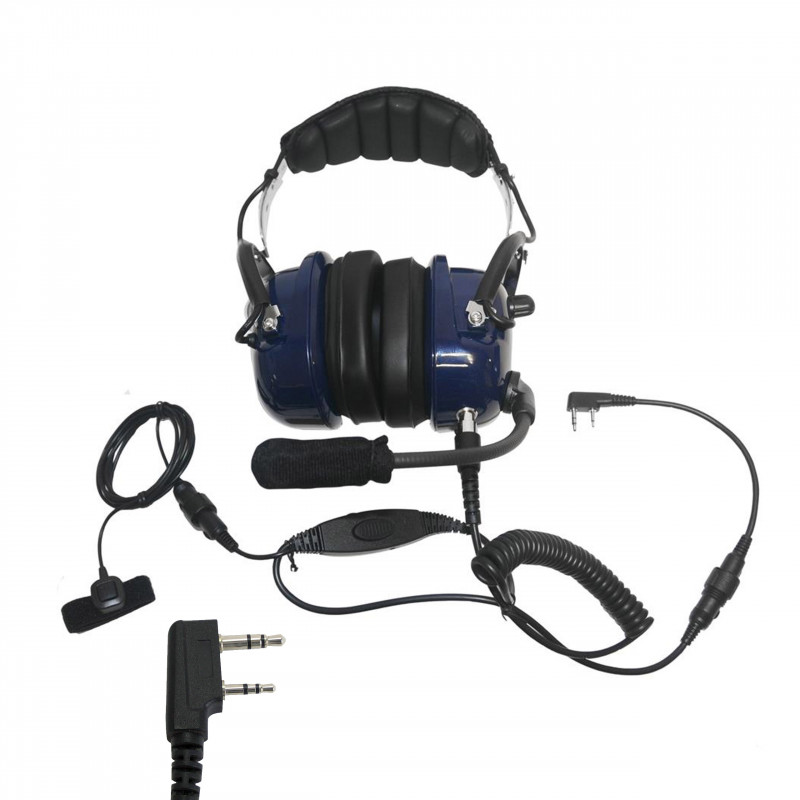 Słuchawki do pracy w hałaśliwym otoczeniu z elastycznym mikrofonem w korpusie, osłoną przeciwwietrzną, przyciskiem PTT, regulacją głośności na kablu i słuchawce i spiralnym kablem (0,5–1,4 m).
